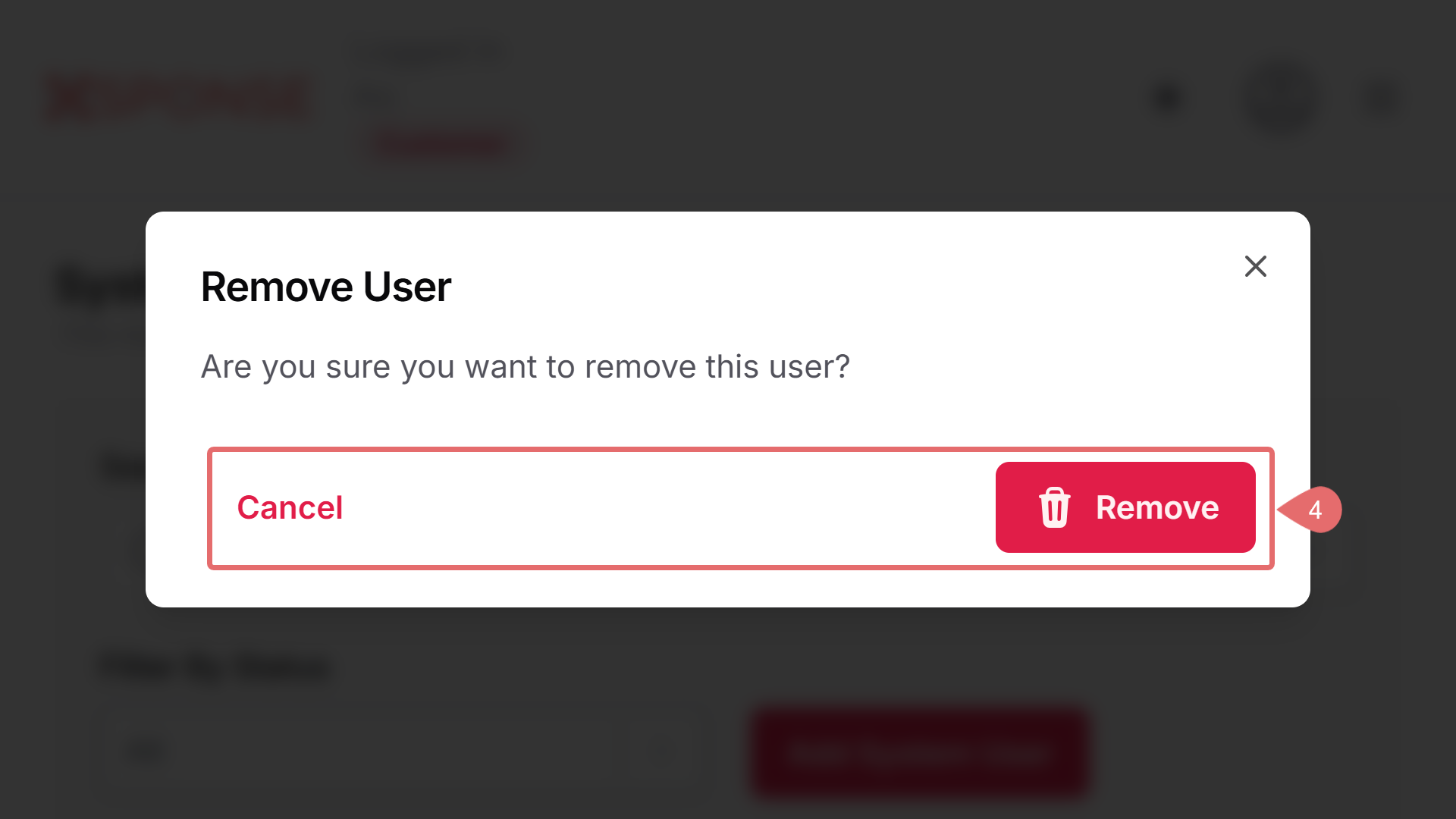 3. In the Actions column, click the Remove User icon to open the Remove User confirmation panel.