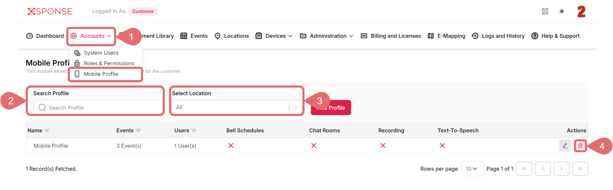 In the Accounts module, you can remove a mobile profile when it is no longer needed or is not assigned to any users. Deleting a profile helps keep your account organized and avoids confusion with outdated or unused configurations.