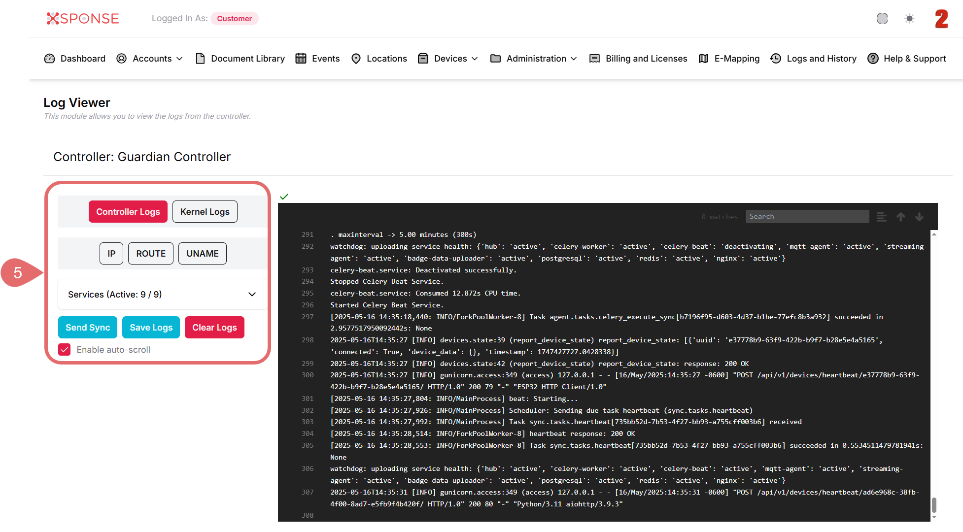 In the Device module, you can access the controller logs to monitor services, detect failures, or perform diagnostics. The log viewer displays key information for maintenance and incident resolution.