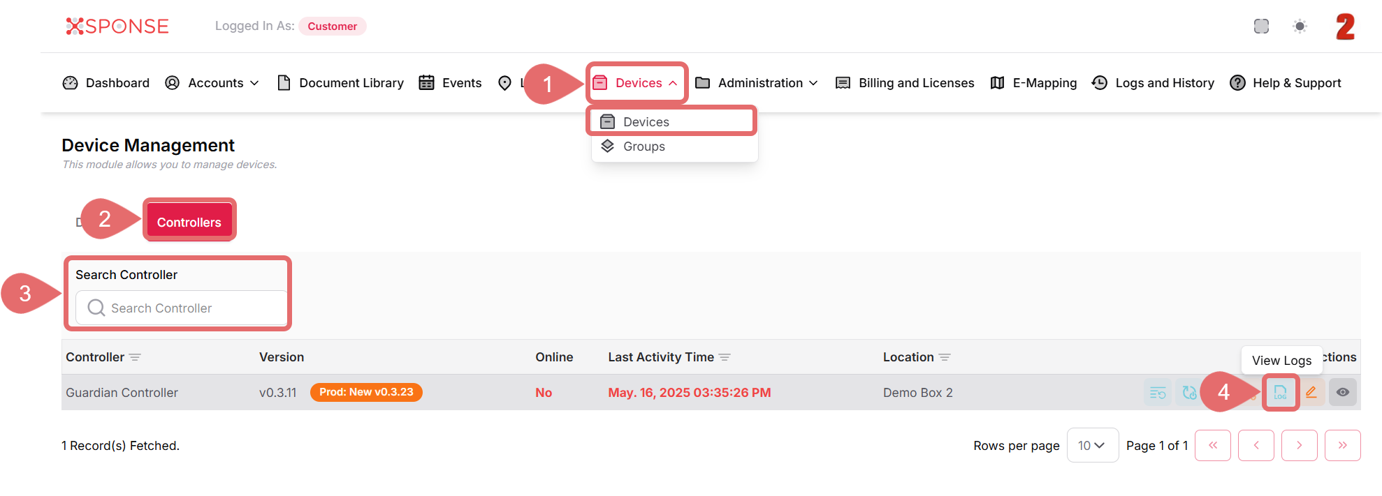 4. In the Actions column, click the View Logs icon.